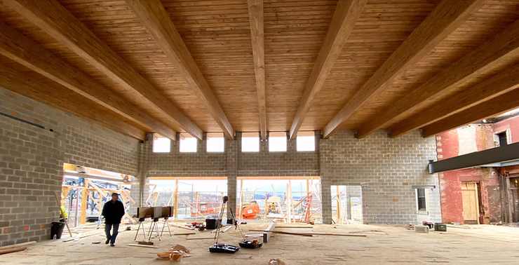 Our event center finally has four walls and a floor in place where we hope many future celebrations will be held! The ceiling is a beautiful wood in a welcoming warm tone. It slopes up towards an inviting wall of folding glass doors. These doors will open up onto the wraparound patio, expanding the indoor ballroom and sharing views of the Steel Stacks. Our front lawn, perfect for wedding ceremonies, will be an organically, natural curated landscape. Our dream is that, whether your celebration is in winter or summer, guests will feel connected to nature. The ballroom will be outfitted with modern light fixtures to keep the space clean and as malleable as possible. We want our guests to have a space where they are free to create the event of their dreams!